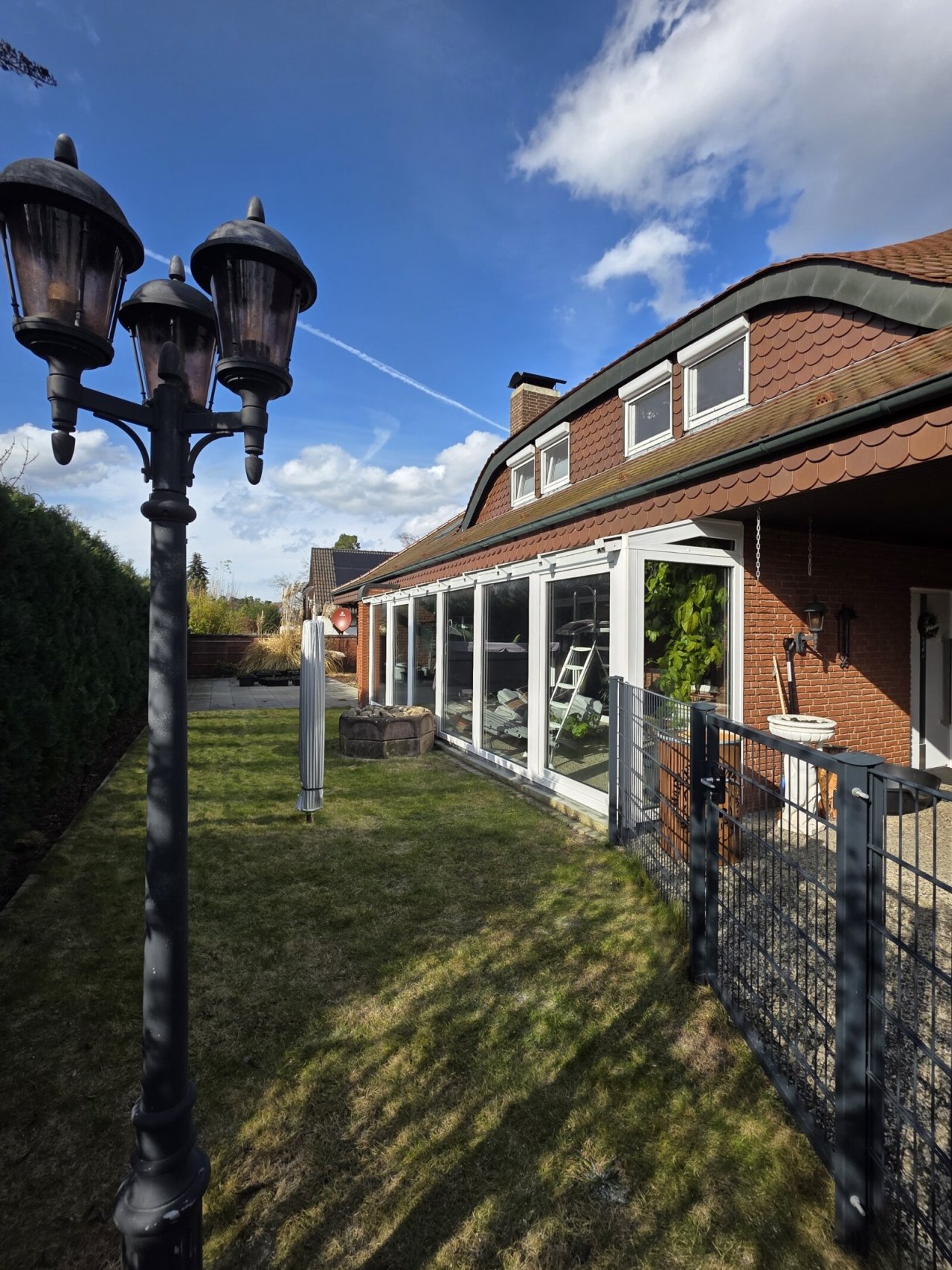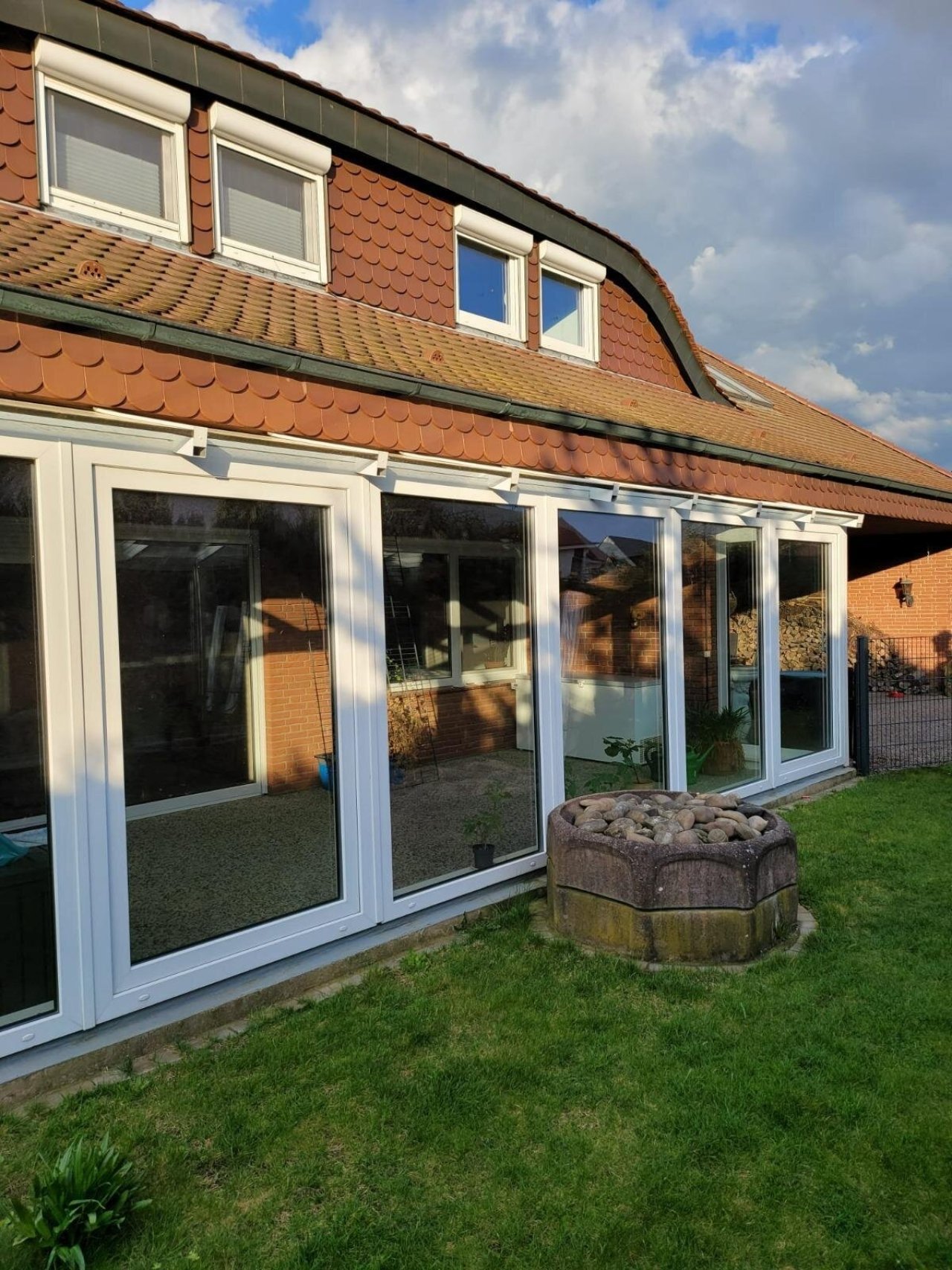 Ein besonderes Highlight ist der zum Wintergarten umgestaltete Terrassenbereich mit großflächigen, dreifach verglasten Schiebeelementen, der ganzjährig für ein angenehmes Wohnambiente sorgt.