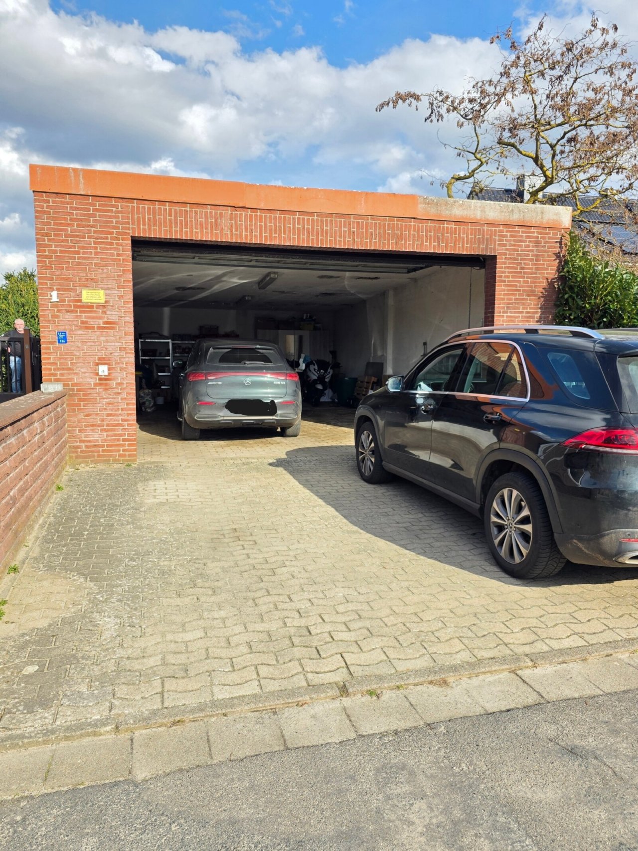 Die Zufahrt sowie der Eingangsbereich sind gepflastert und werden durch eine elektrische Toranlage mit Gegensprechanlage gesichert. Zusätzlich ist das Objekt videoüberwacht. Zwei Garagen mit elektrischen Sektionaltoren sowie weitere Stellmöglichkeiten bieten Platz für insgesamt ca. 5 bis 6 Fahrzeuge.