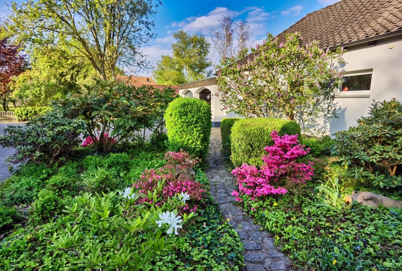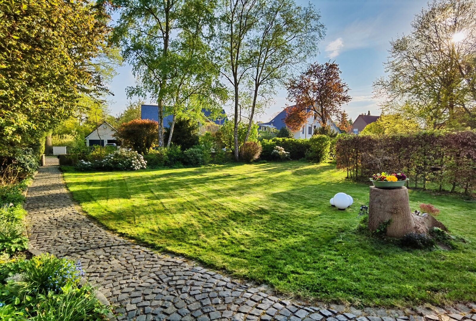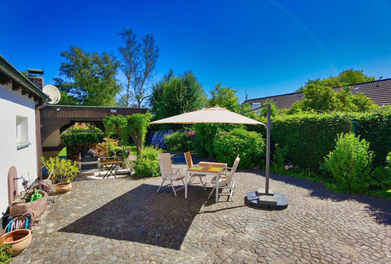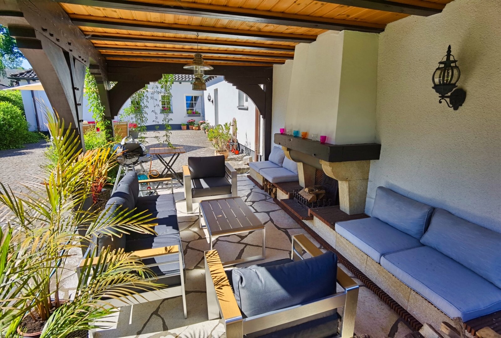 Das Haus verfügt über zwei Terrassen, von denen eine aufwendig überdacht ist und mit einem Außenkamin ausgestattet wurde – ideal für entspannte Abende im Freien. Der gepflegte Garten auf dem ca. 1.600 m² großen Grundstück bietet viel Raum zur Erholung und individuellen Gestaltung.